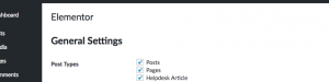 To enable Elementor to work with Helpie. Go to Dashboard -> Elementor -> Settings -> Post Type and check the ‘Helpdesk Article’ post type.